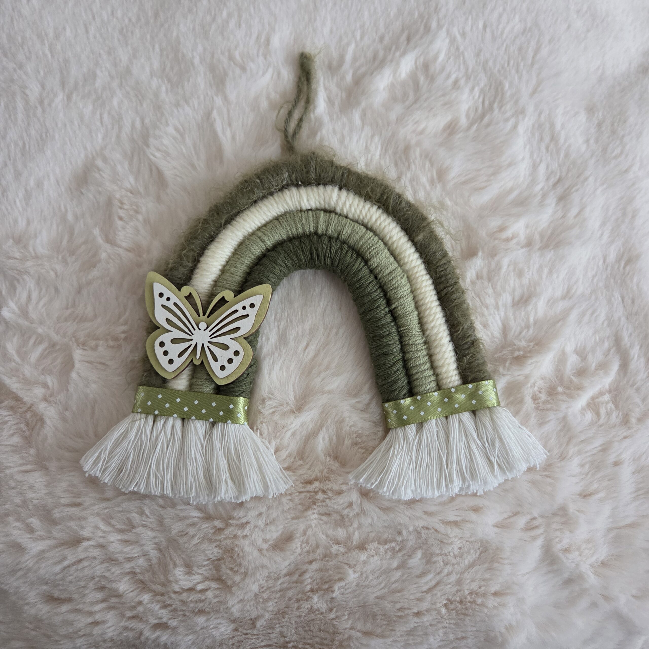 Apportez une touche douce et poétique à votre décoration avec cet adorable arc-en-ciel en macramé. Entièrement réalisé à la main, il associe une corde macramé écrue naturelle à des fils de coton et de laine aux teintes vertes et écrues, pour un rendu à la fois chaleureux et apaisant. Ajout d’un joli papillon en bois et d’un ruban aux couleurs assorties.