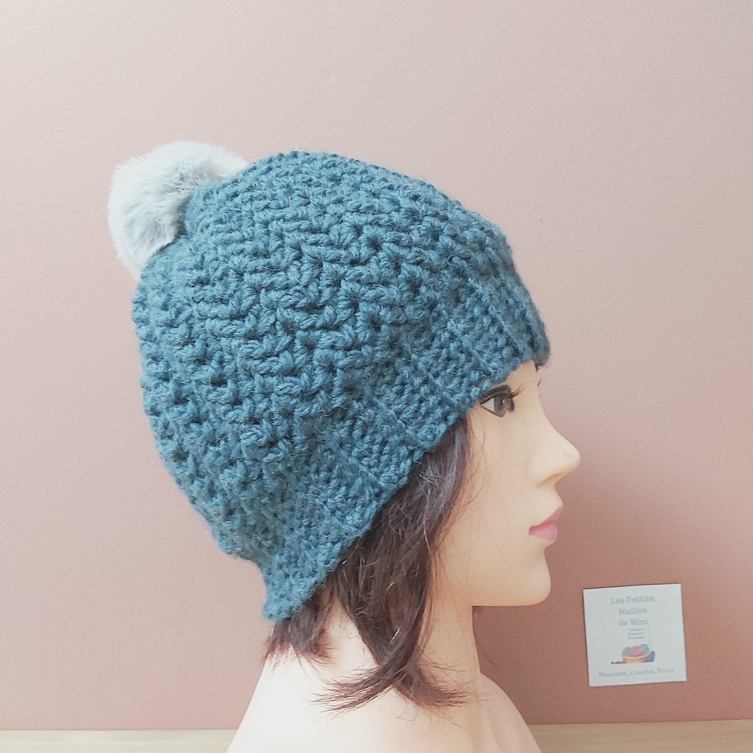 Alliez chaleur et style avec ce bonnet vert réalisé au crochet dans un joli point fantaisie et orné d’un pompon gris tout doux.