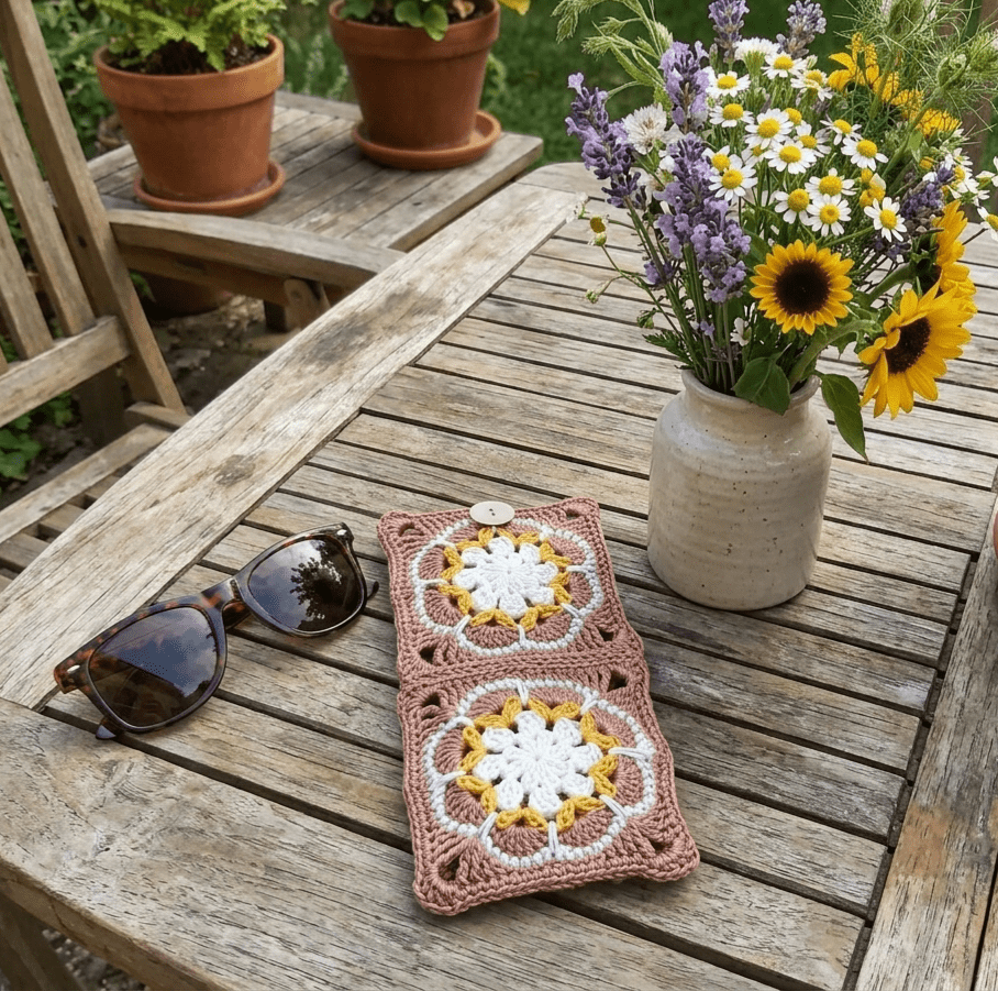 Craquez pour cet étui à lunettes fait main au crochet en coton, au joli motif floral granny square marron, écru et moutarde.