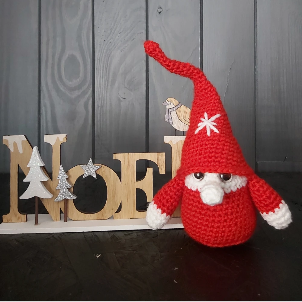 Gnome réalisé au crochet, en laine rouge et blanche. Pour une jolie décoration de Noël originale et fait main. Il mesure 22 cm de hauteur totale. Utilisation des yeux de sécurité.