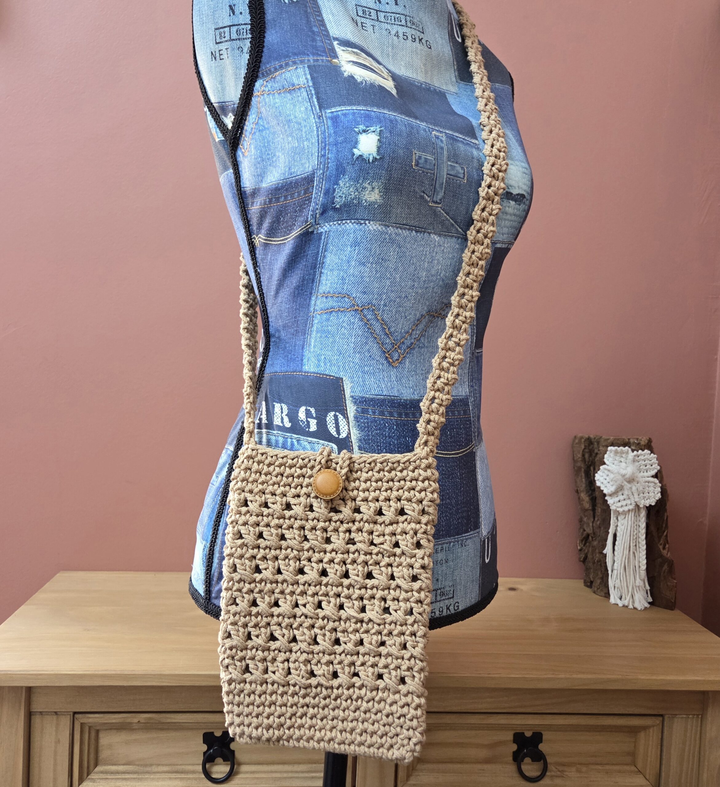 Pochette pour téléphone portable réalisée au crochet en coton résistant coloris camel. Pratique et élégante avec son joli point fantaisie, elle protège votre téléphone tout en ajoutant une touche artisanale à votre style. Fermeture par un joli bouton pour une finition soignée et authentique.
