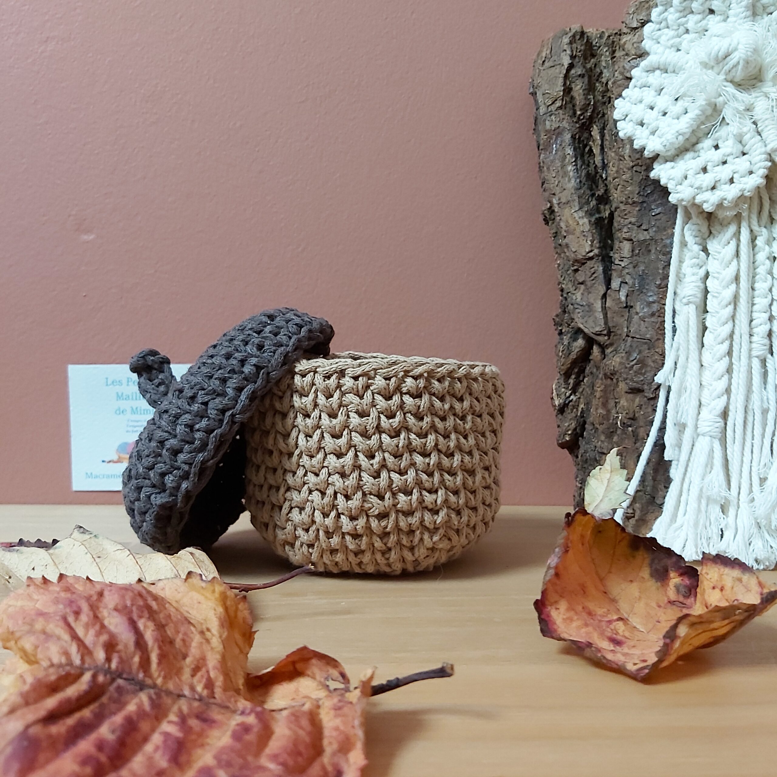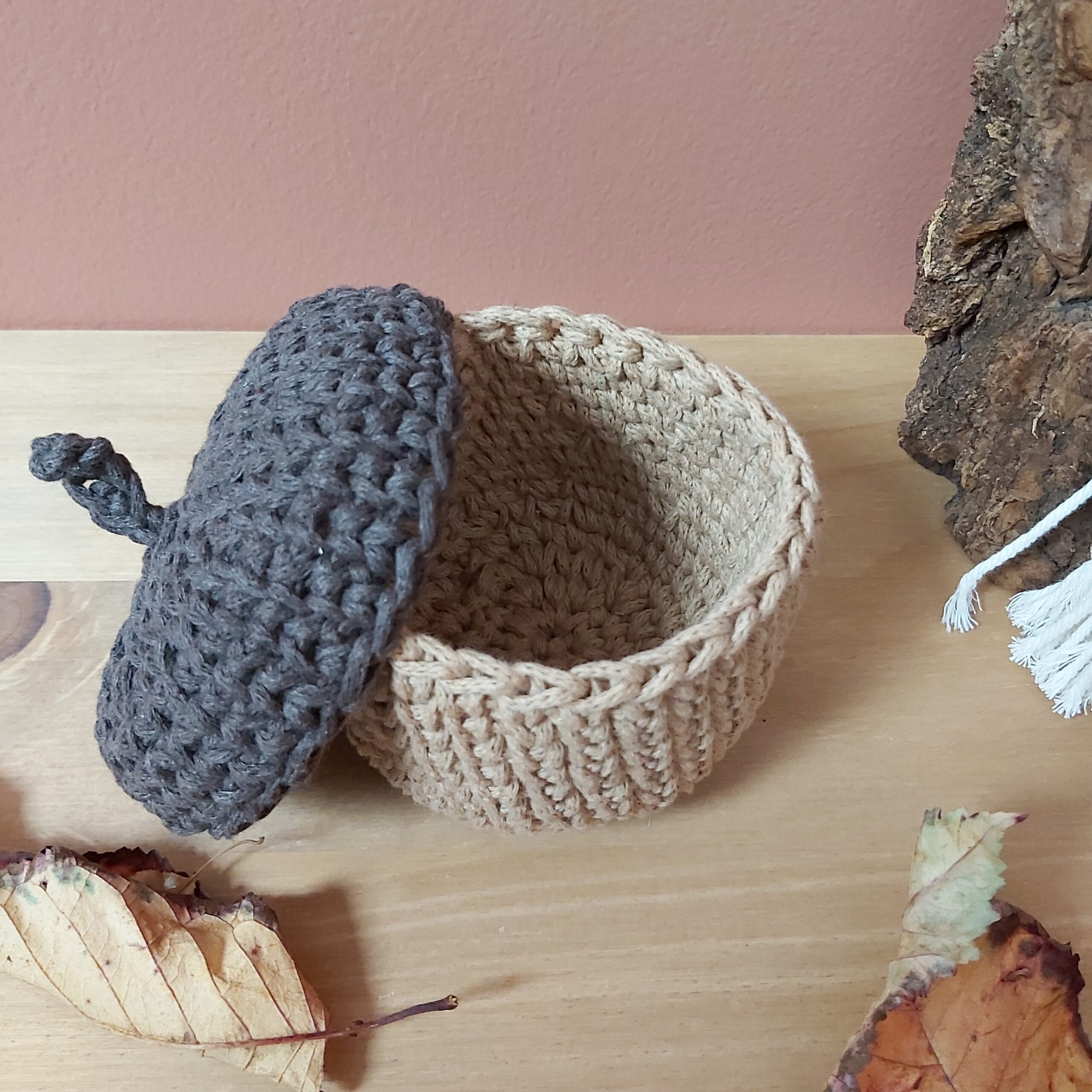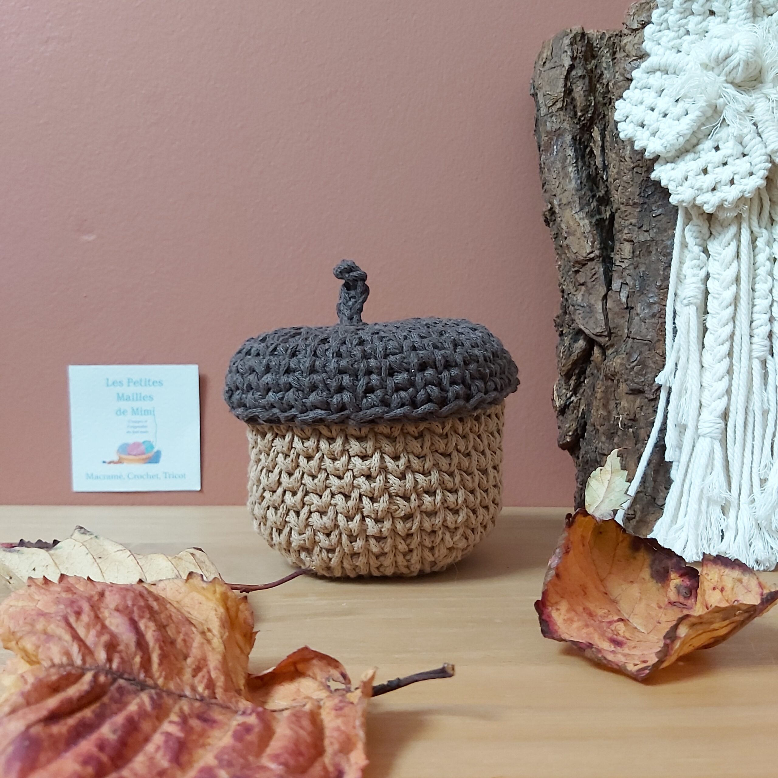 Ce petit pot vide-poche en forme de gland a été crocheté avec soin pour mêler nature, douceur et fonctionnalité.