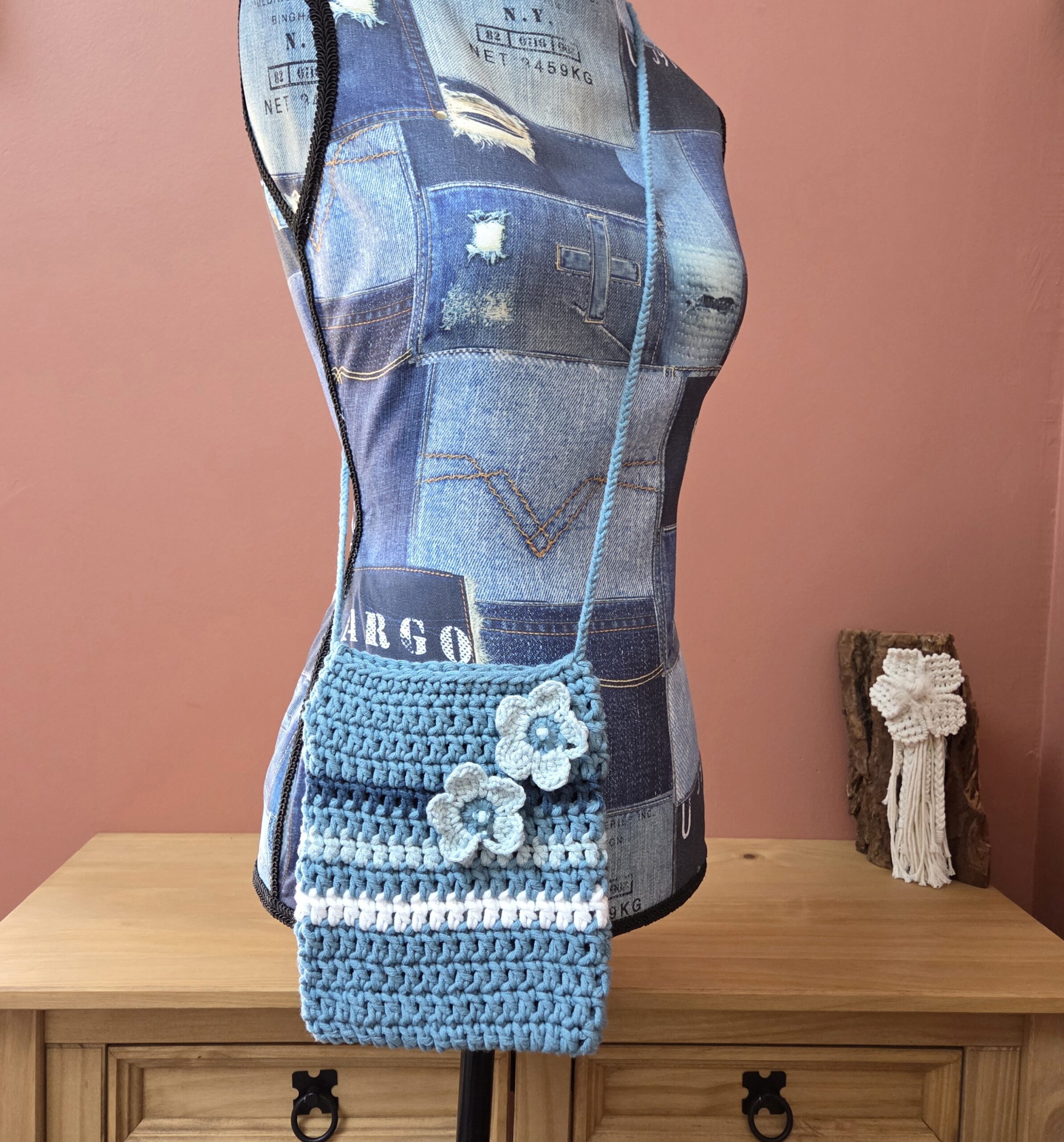 Ce sac à bandoulière est entièrement réalisé à la main au crochet avec un fil de coton bleu canard, turquoise clair et blanc, pour un rendu naturel et élégant. Il est agrémenté de deux jolies fleurs assorties, également crochetées à la main, qui apportent une touche délicate et féminine.