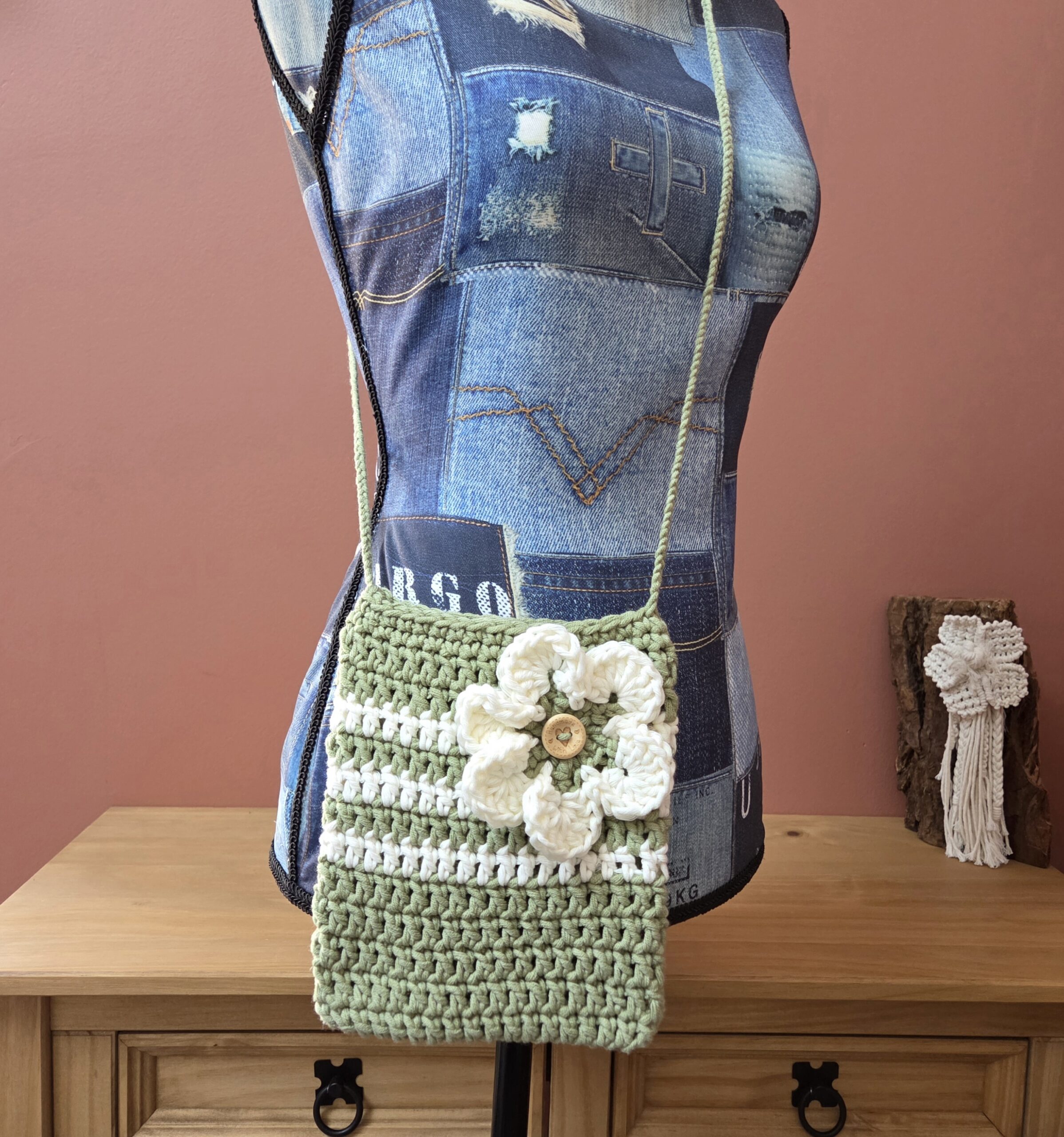 Ce sac à bandoulière est entièrement réalisé à la main au crochet avec un fil de coton vert et écru, pour un rendu naturel et élégant. Il est agrémenté d’une jolie fleur assortie, également crochetée à la main, qui apporte une touche délicate et féminine. Un bouton en bois gravé “handmade with love” vient compléter cette création artisanale et souligner son authenticité.