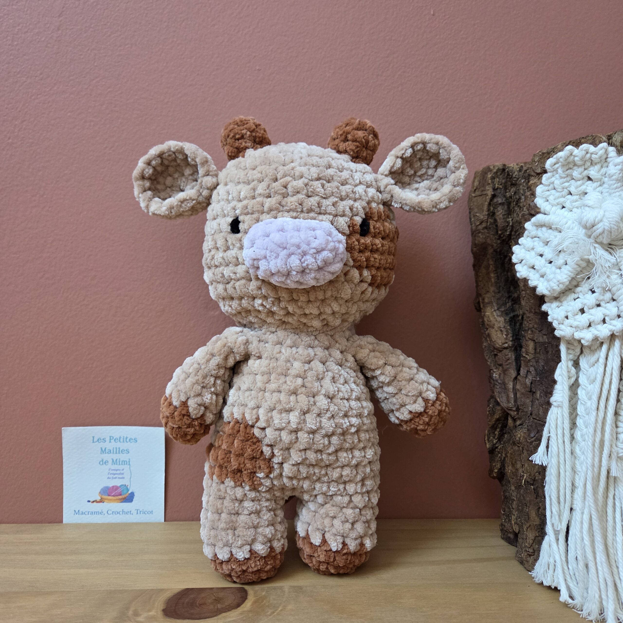 Adorable vache réalisée au crochet, avec une douce laine chenille qui lui donne un toucher velouté et réconfortant. Elle est confectionnée dans deux jolies nuances de marron, apportant chaleur et élégance à son apparence.